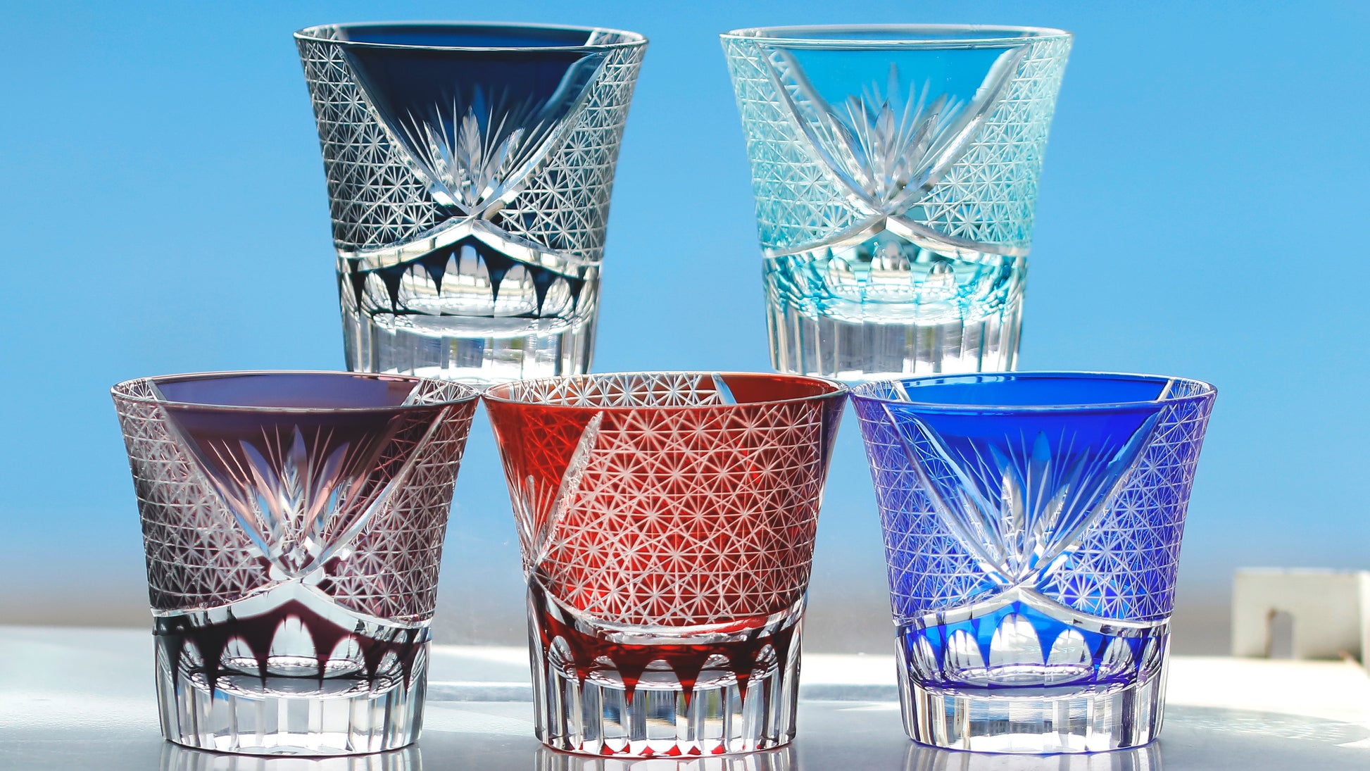 JP-017 220ml Flared Shaped Hand Cut Table Drinking Tumbler Edo Kiriko's Sea Wave Sky Blue Whiskey Tumblers