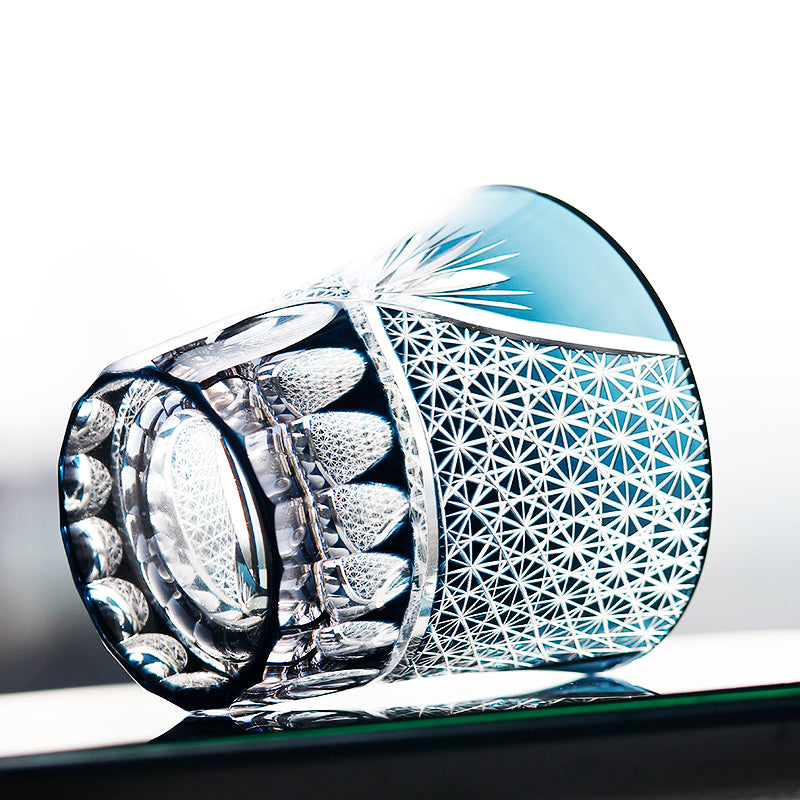 JP-017 220ml Flared Shaped Hand Cut To Clear Table Tumbler Smokey Blue Color Cased Glass Whiskey Tumblers Blue Edo Kiriko Bamboo leaves Rock glass