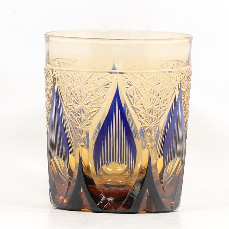 JP-020 8.5 oz Blue and Amber Tinted Glass Whiskey Tumbler With Hand Engraved candle flame Design