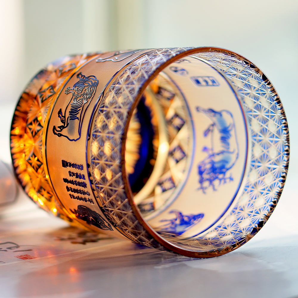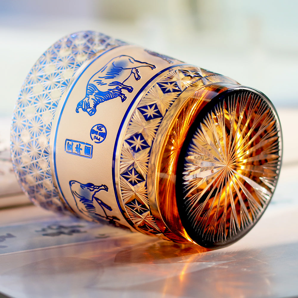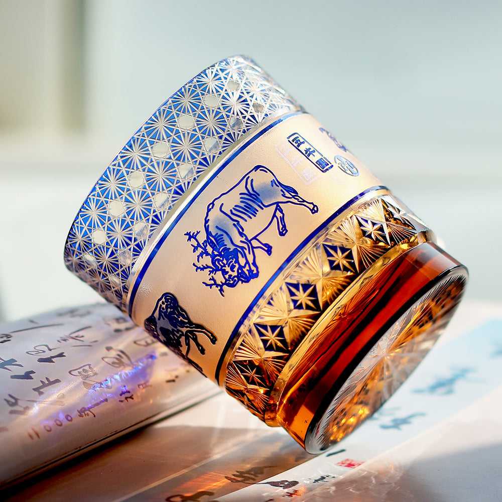 JP-023 240ml Handcrafts Blue Amber Whiskey Glass With Engraved Chinese Characteristics--painting five cows