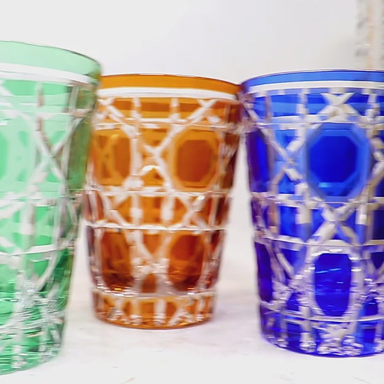 JP-045 Blue and Clear overlaid Crystal Glass Highball Glass Tumblers---Hand engraved big diamond Patterns