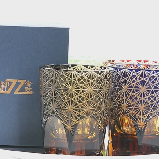 JP-048 250 ml Classic Japanesque Style Edo Kiriko Black and Amber Color Overlay Glass Whiskey Tumblers with Hand cut Chrysanthemum Design