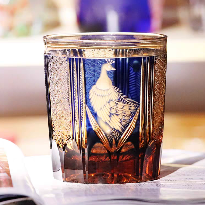 JP-112 8.5oz Edo Kiriko Style Blue and Amber Cocktail Glass Tumbler Colored Crystal Glass Whiskey Tumblers
