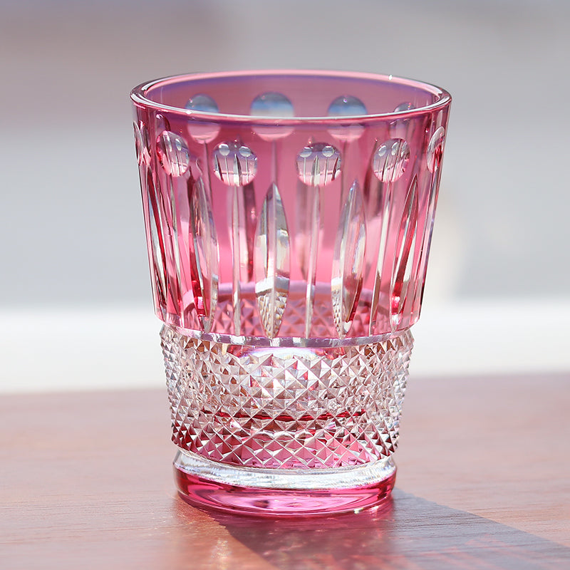 JP-095 Hand Cut And Pink Colored Crystal Glass Cocktail Whiskey Tumbler With Diamond Pearl Star-Cut For Beverage Social Drinkers